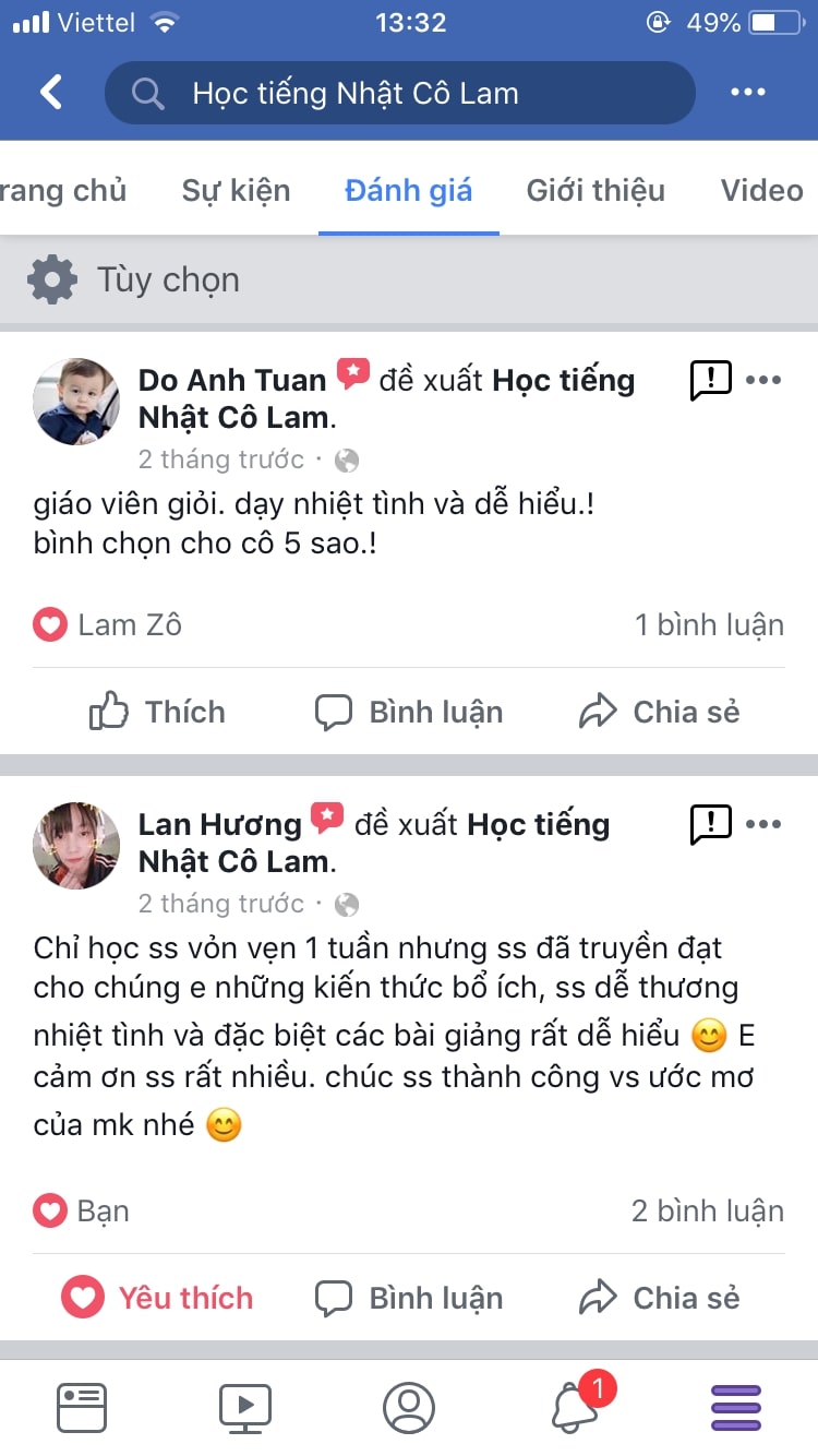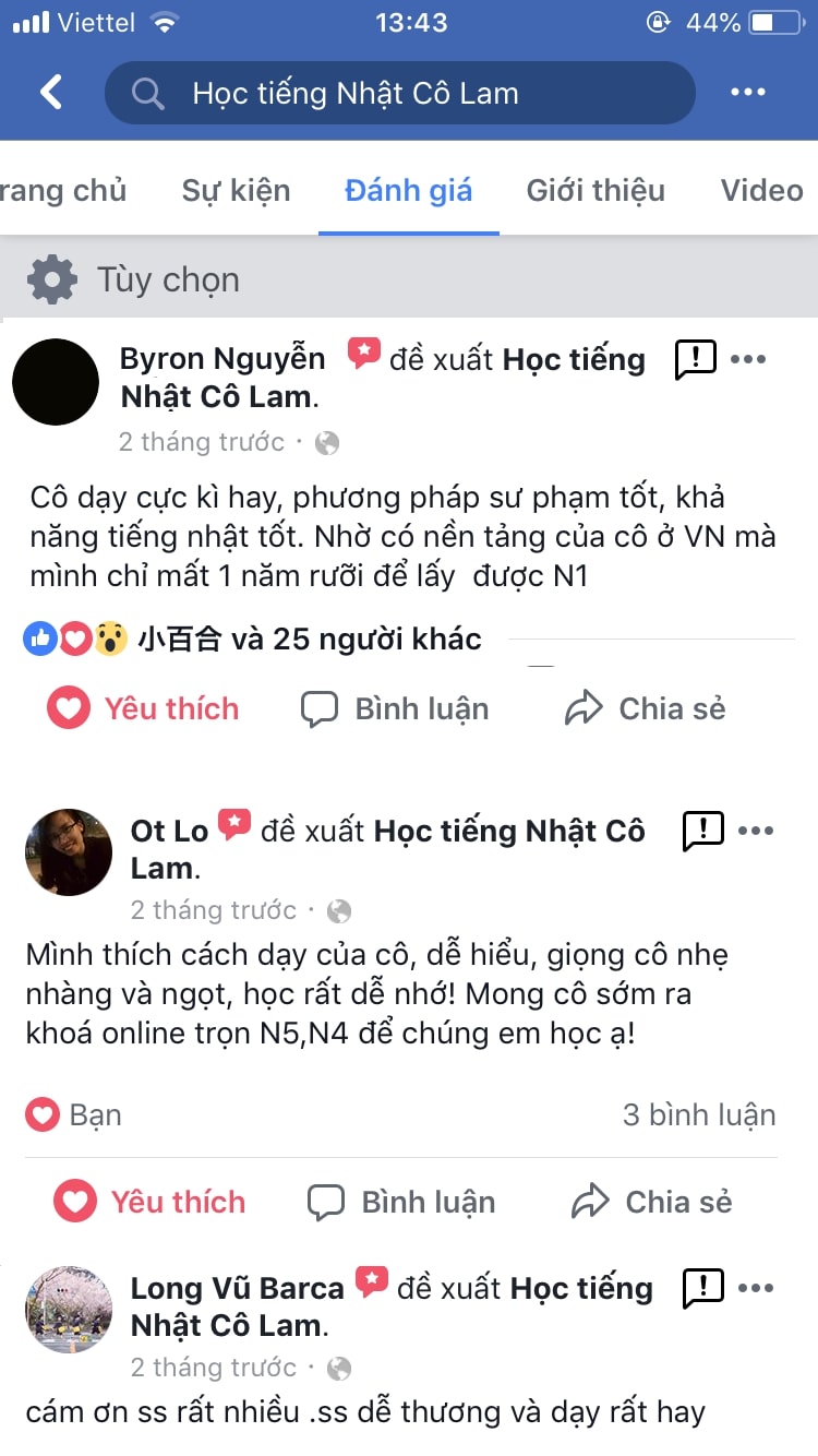 Hiện nay các trung tâm học tiếng Nhật thành lập rất nhiều, nhưng để chọn ra một nơi có thể tin tưởng để học sinh có thể yên tâm về chất lượng cũng như đầu ra thì không nhiều. Em đã không sai khi chọn cô cùng với tiếng Nhật cô Lam để chinh phục tiếng Nhật trong con đường học tập của em . Nếu chọn lại 1000 lần thì em vẫn sẽ chọn cơ hội được học cùng với cô . Mà khoá học của cô được đầu tư công sức kĩ lưỡng nhưng mà giá sinh viên lắm luôn. Em cũng đã giới thiệu cho các bạn khóa học sơ cấp của cô, mọi người cũng khen quá trời. Nói gọn lại thì tiếng Nhật đúng là khó, nhưng học thì sẽ không khó khi có cô Lam nhé các bạn.