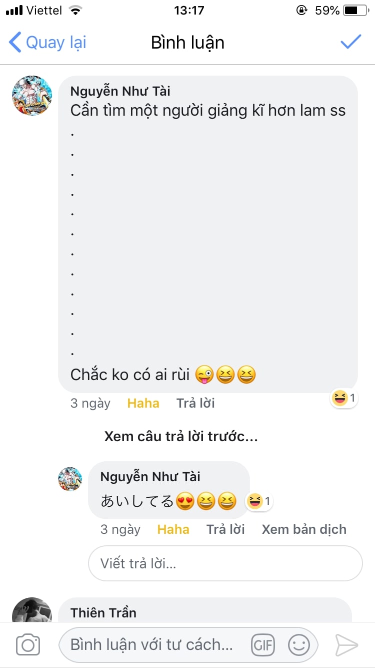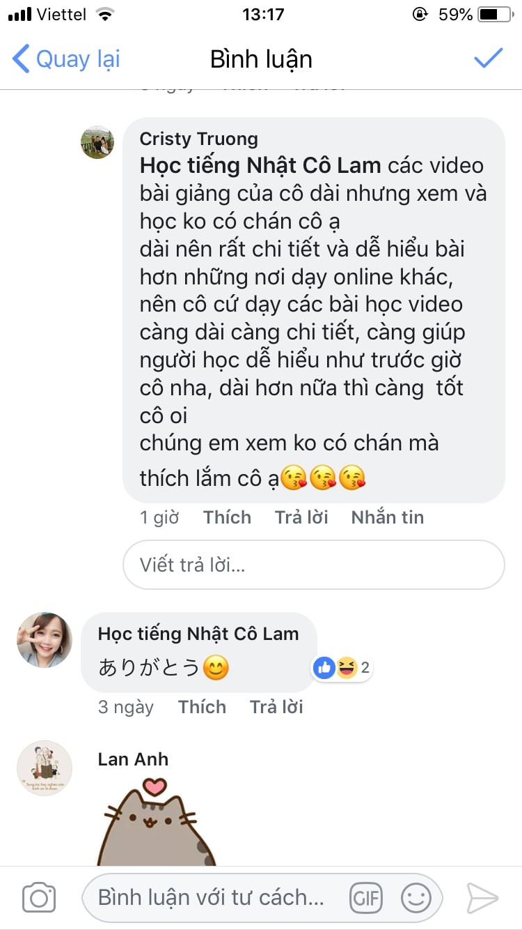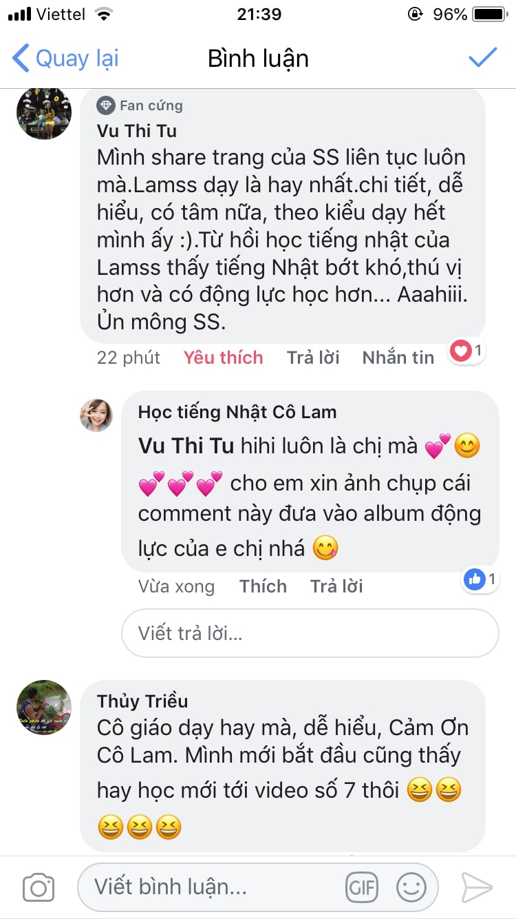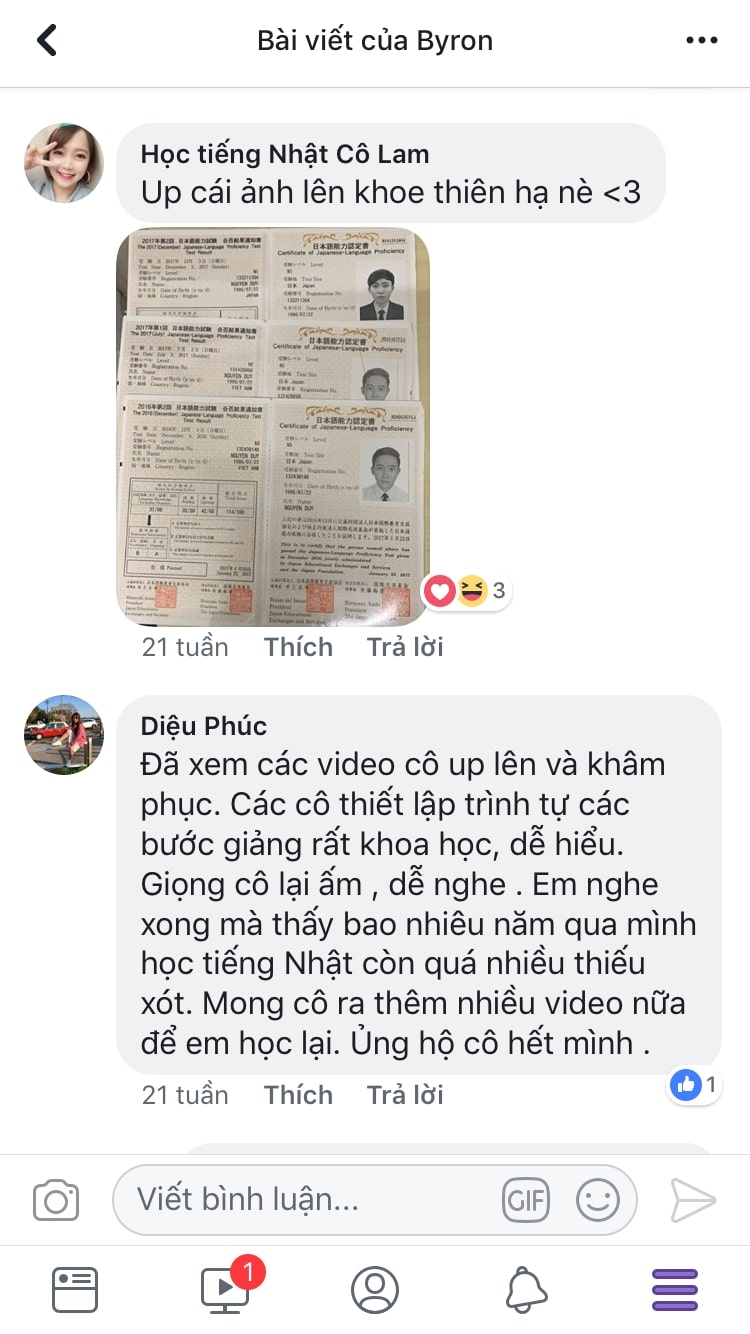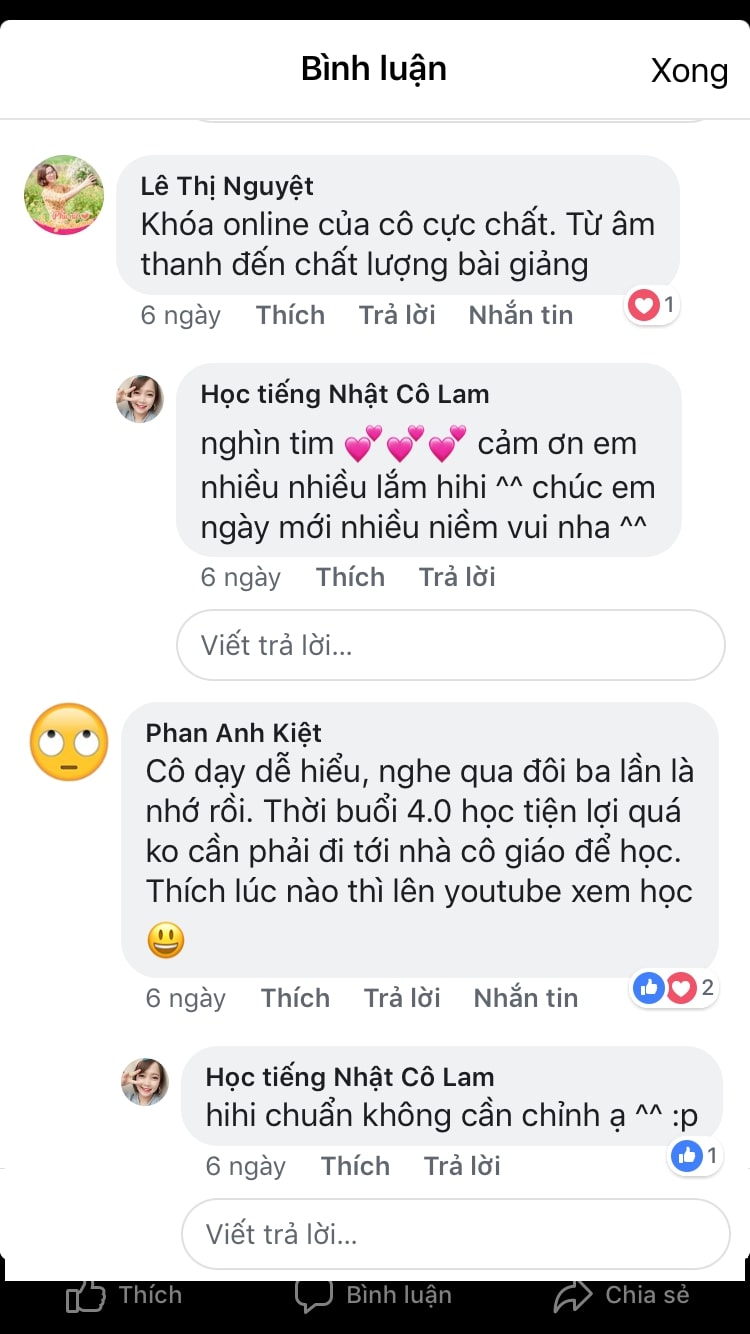 Từ khi lỡ sa vào web của Lam sensei, ngày nào em cũng học tiếng Nhật lun, mê Lam sensei như điếu đổ hahaa Chỉ mới 4 tháng thui mà em đã chinh phục được hết ngữ pháp N5 và N4 rồi, em quyết định sẽ theo sensei cho tới khi nào em chinh phục được JLPT N2 ạ. CÓ LAM SS EM ĐÃ NHẬN RA ĐƯỢC TIẾNG NHẬT KHÔNG KHÓ NHƯ LỜI ĐỒN.