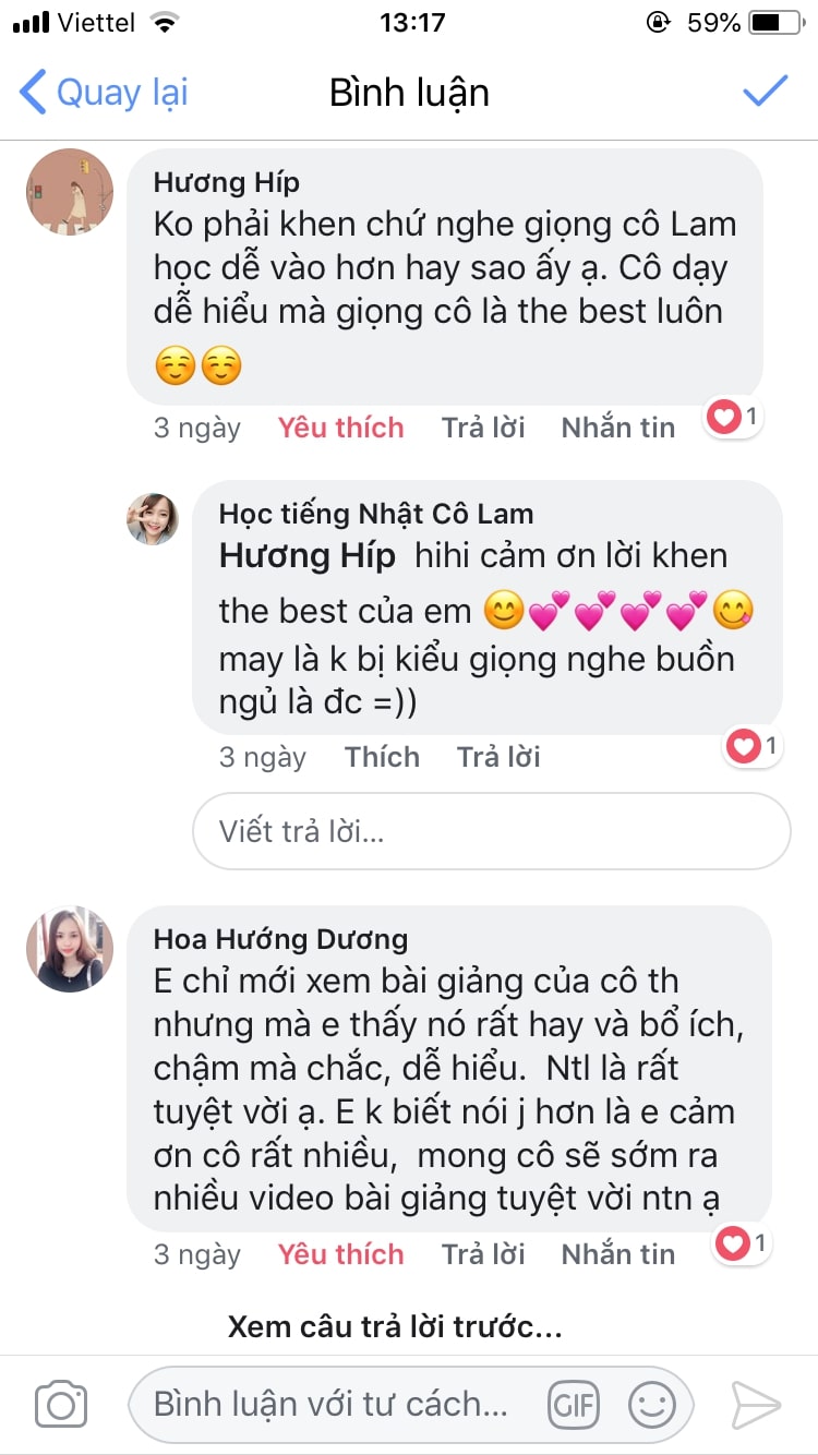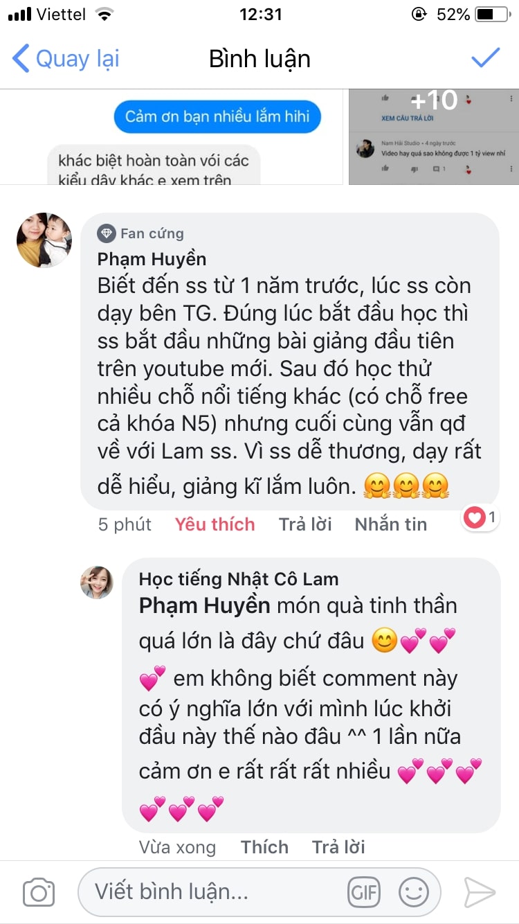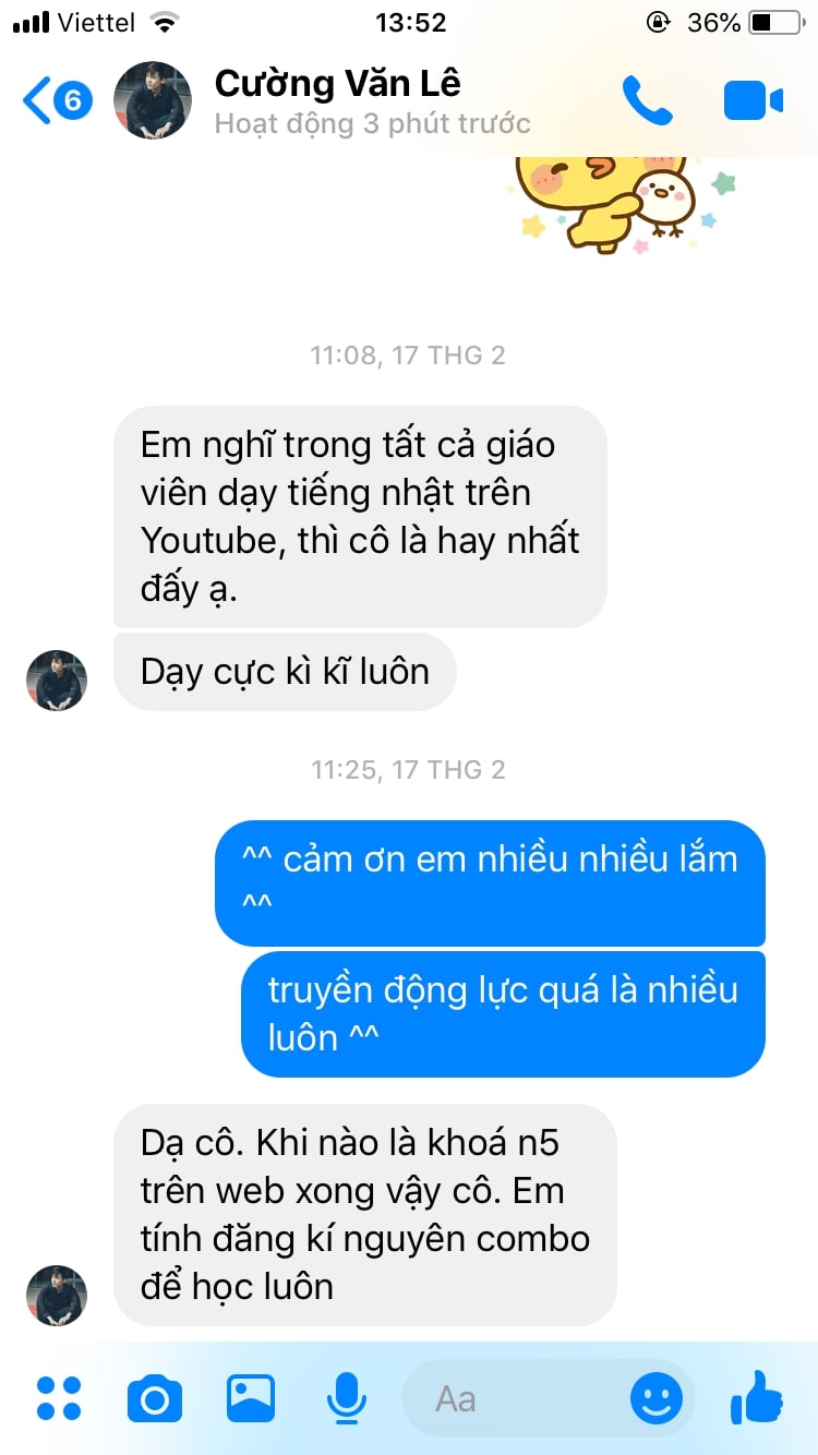 Em cảm ơn cô vì những công sức cô đã bỏ ra để cho ra những khóa học rất chất lượng như thế này. Tinh thần siêng năng và tự học là một chuyện, nhưng với cách truyền dạy của cô thì lại càng giúp tinh thần của em được nâng cao hơn rất rất là nhiều. Em cũng từng nghĩ có thể mình sẽ tiết kiệm hơn nếu học bằng những bài giảng miễn phí trên Youtube hay Facebook hoặc tự mày mò trong sách thay vì đăng ký một khóa học Online cũng bằng video quay sẵn.Cho đến khi quyết định bắt đầu chọn cô và đi cùng cô trong chặng đường học tiếng Nhật thì mới nhận ra rằng cái gì cũng có cái giá của nó cả. Đặc biệt là với khóa học của cô. Những kiến thức không có trong sách, những kiến thức chỉ có thể biết bằng kinh nghiệm lâu năm hay là bằng sự tìm tòi tận tâm. Giống như cô nói khi kết thúc khóa N4, đặt mình vào vị trí các bạn học viên để hiểu được các bạn cần gì mà truyền đạt.Có đôi khi em cũng bị ngạc nhiên ấy ạ. Kiểu như em chỉ đang suy nghĩ những câu hỏi ấy trong đầu thôi nhưng liền ngay sau đó cô lại trả lời luôn những điều em đang thắc mắc.Xong rồi tự há hốc mồm ra, sao cô siêu nhiên thế, mình chỉ đang nghĩ trong đầu thôi mà. Em quyết định tiếp tục đăng ký khóa N3 của cô luôn. Cô không biết là em đã mong chờ từ khi còn đang học N4 như thế nào đâu ạ