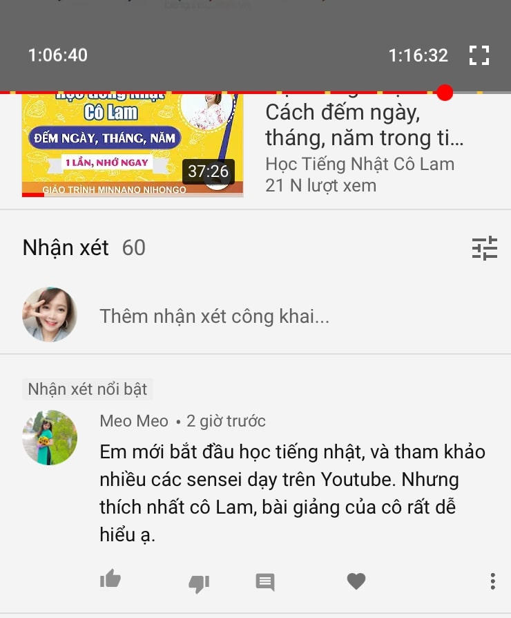 Tiengnnhatcolam.vn để học khoá N5 - dạy hoàn toàn miễn phí nhưng rất đầy đủ và bài bản như học tại Trung tâm. Từ đó, mình biết rằng đây chính là nơi sẽ đi cùng mình trên chặng đường chinh phục tiếng Nhật. Cô giảng rất cặn kẽ, chi tiết và nhiều ví dụ vì thế các video của cô có thời lượng khá dài. Nhờ đó mà những thắc mắc lúc trước của mình khi học Tiếng Nhật, nay đã có lời giải đáp. Các video của cô đều được quay sẵn nhưng dường như bài nào cô cũng đoán được học sinh cần gì, thắc mắc chỗ nào mà trình bày sẵn trong video, rất dễ để tự học.