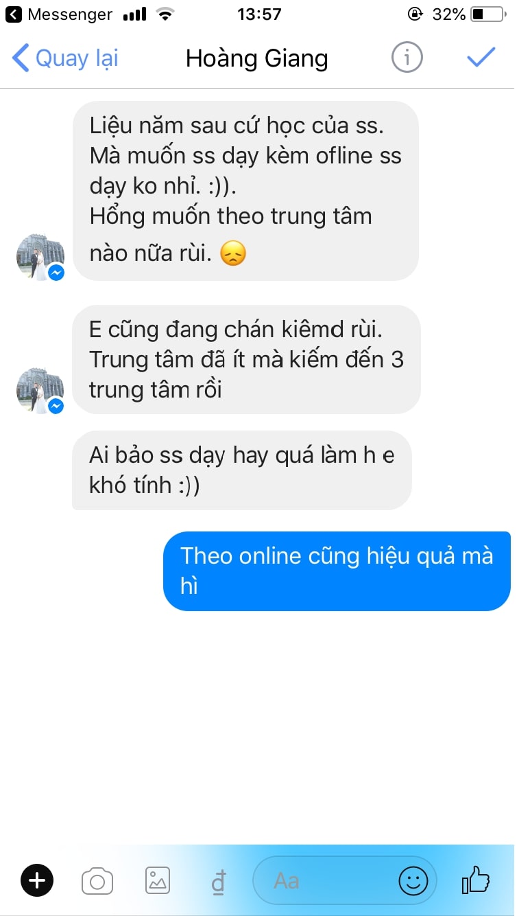 Bài giảng của cô lấy nhiều ví dụ rất chi tiết, thực tế. Một điều nữa là cô hay liệt kê ra mấy trường hợp ngoại lệ, nhắc chúng em học kĩ bởi có thể xuất hiện trong đề thi. Học online mà không khác gì được tương tác trực tiếp với cô luôn ấy. Cô super dễ thương và giảng rất chi tiết, kiểu cô biết chỗ nào học sinh hay mắc lỗi, chỗ nào dễ nhầm ngữ pháp. Một điều em cũng cực kì tâm đắc khi học với cô là cô rep inbox rất nhanh khi học sinh đặt câu hỏi, thắc mắc về bài giảng.