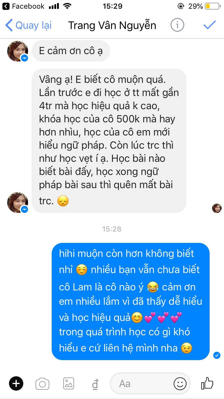 Lời đầu tiên, em rất rất cảm ơn cô đã đồng hành với em trong quá trình học tập tiếng Nhật. Cảm ơn những bài giảng vô cùng dễ hiểu, sinh động, gần gũi và cực kì tận tâm của Lam sensei. Cô giảng bài cẩn thận lắm luôn ấy, em đã có bước tiến nhanh so với các bạn học cùng trên lớp nhờ vào các buổi học của cô đấy ạ.