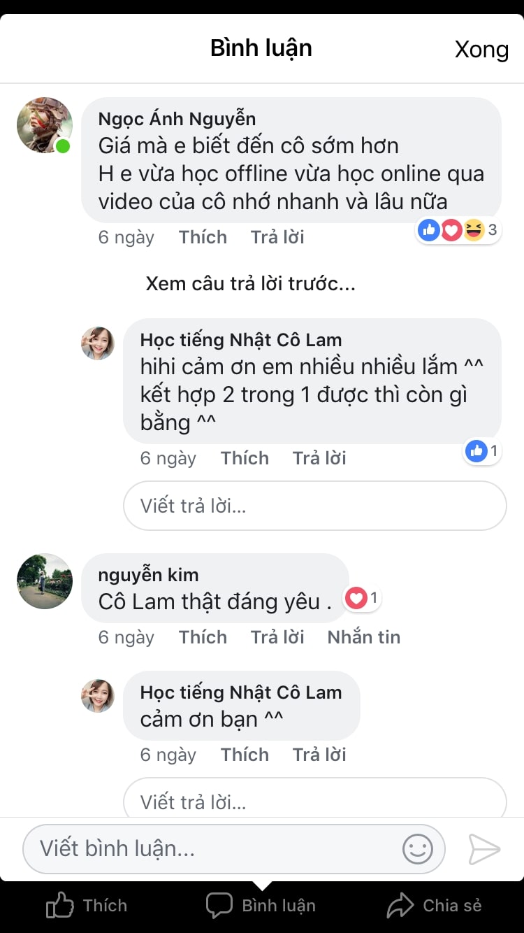 Mình muốn nhắn nhủ đến các bạn, học ngoại ngữ không bao giờ là quá trễ để bắt đầu, nếu muốn học online thì tiếng Nhật Cô Lam là đầy đủ, chi tiết, dễ hiểu nhất và có lộ trình rõ ràng nhất các bạn nhé.